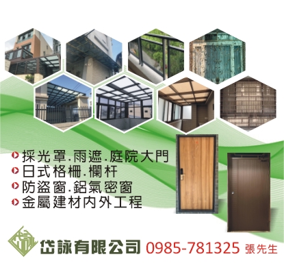 台中鍛造鐵門窗、台中東區採光罩工程、彰化不銹鋼採光罩、南投玻璃採光罩、苗栗不鏽鋼玻璃採光罩、台中PC板採光罩、霧峰玻璃採光罩、沙鹿採光罩、台中雨遮施工、太平不銹鋼雨遮、南投玻璃雨遮、大雅鍛造玄關門、大里空中花園、台中北屯玻璃屋施工、草屯玻璃屋、彰化和美玻璃屋、南投日式格柵、台中西區防盜門窗、埔里防盜門窗、新社防盜門窗、台中鍛造門窗、烏日潭子鍛造門窗、北區南區鍛造門窗、台中玄關內外門、南屯玄關內外門、台中日式格柵、北屯日式格柵、大里扶手欄杆設計、台中鍛造欄杆、台中市鍛造格柵欄杆、台中氣密窗施工、彰化氣密窗、台中百葉窗、南投百葉窗、台中東區南方松地板、台中西區南方松格柵、苗栗鍛造採光罩、太平玻璃採光罩、苗栗採光雨遮、埔里玻璃採光罩施工、專營藝術鍛造門、藝術鍛造窗、精品訂製、欄杆、扶手、不銹鋼防盜門窗、日式格柵、日式欄杆、玻璃欄杆、庭院大門、鍛造採光罩、玻璃採光罩、PC板採光罩、各式雨遮、南方松木地板、南方松格柵、鋁氣密窗、百葉窗、玄關內外門、電動捲門、新式鐵皮屋不銹鋼防盜門窗、鍛造欄杆、鍛造鐵窗、鍛造門窗、鍛造扶手、鍛造大門、鍛造採光罩、不銹鋼噴砂玻璃採光罩、不銹鋼反射、玻璃採光罩及雨遮系列、空中花園、鍛造精品、鍛造樓梯、鍛造車庫、鍛造窗、南方松採光罩、鍛花採光罩、強化噴砂玻璃採光罩、南方松採光罩、不銹鋼玻璃壓板、各式金屬建材設計、岱詠